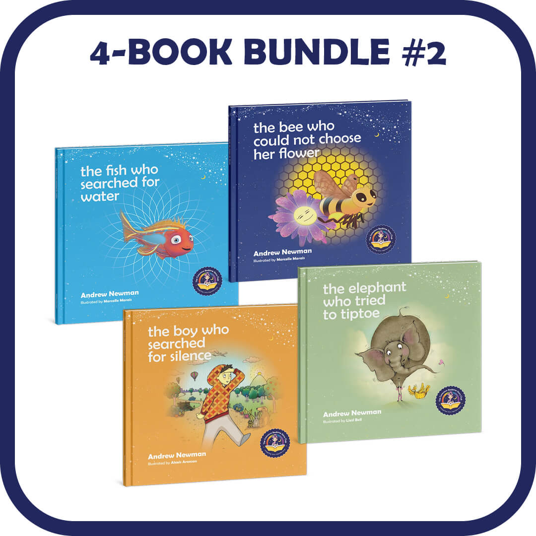 Nobody is too young or old for deep breaths and story time. These books are as much for parents to connect and open dialogue as they are for children. The rhyming picture books — The Elephant Who Tried to Tiptoe, The Forgetful Elephant, The Bee Who Could Not Choose Her Flower, The tree of Goodness and The Laughing Witch — are great for your youngest little ones. The collection will be with you for many years, so trust your impulse. You know your family best.